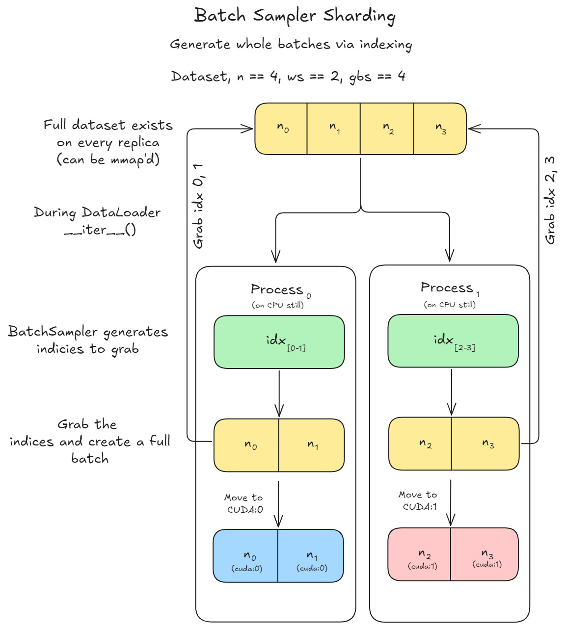 Unlike iterable dataset sharding, where each worker directly pulls raw data in its __iter__, batch sampler sharding first generates indices that specify which items to fetch. These indices are grouped into batches, which are then collated into tensors and moved to CUDA for training.