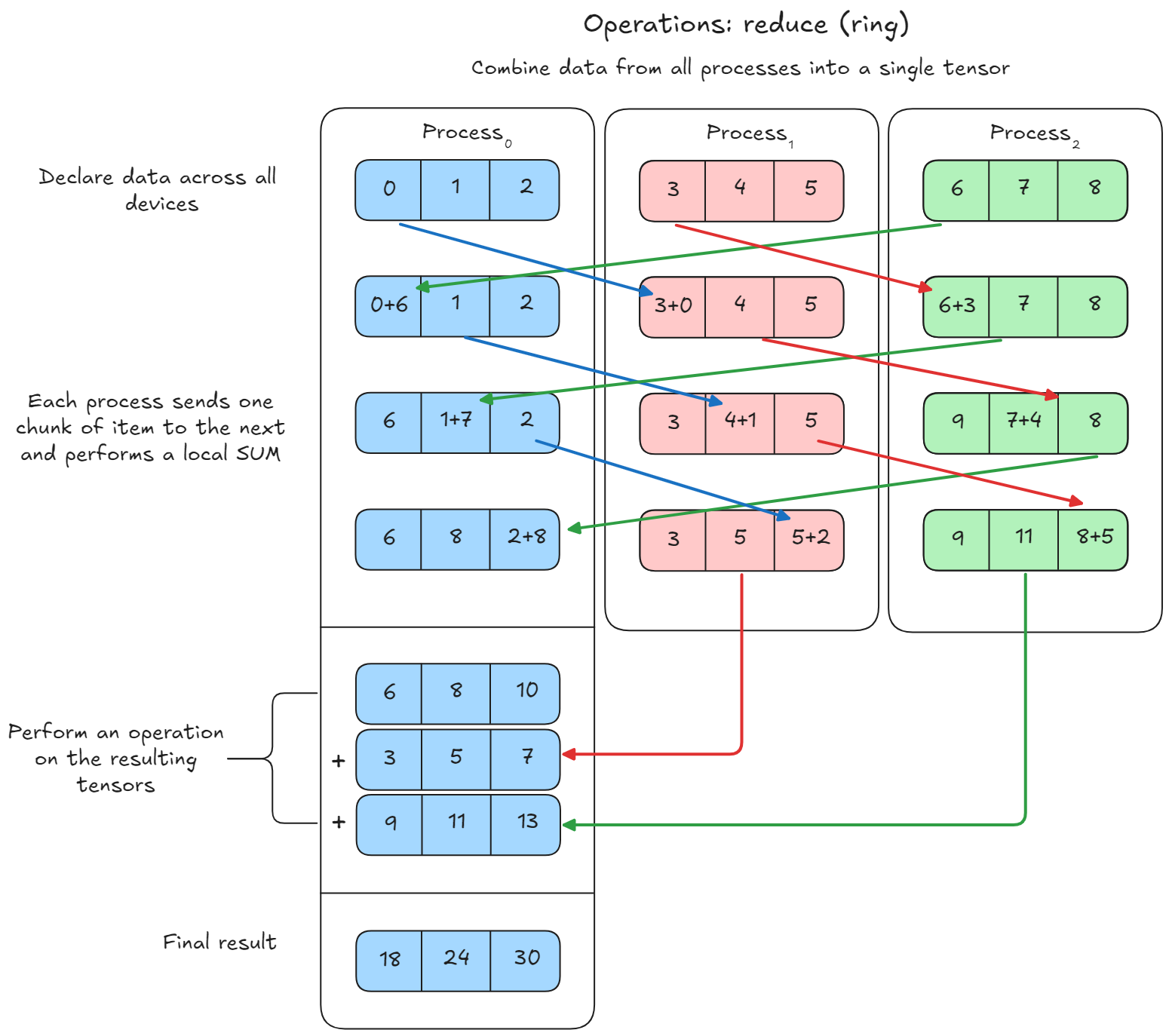 Ring-reduce (torch’s default reduce operation) is a bandwidth-friendly way to add a large tensor that is split across several GPUs or machines.